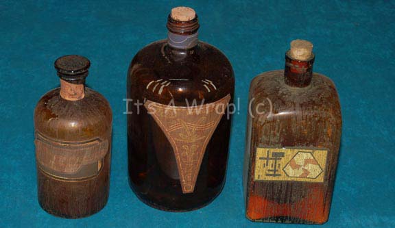A lot of three set dressing glass bottles like those appearing variously in episodes of Star Trek: Enterprise like “The Xindi”. The items are brown colored glass bottles with graphical applications adhered to their exteriors. The bottles are distressed to appeared ‘aged’ with a paint based wash that is long … |