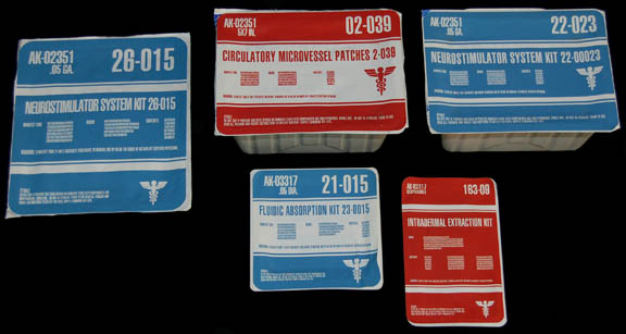A lot of five medical supplies containers made for use on the Star Trek: Enterprise series. Each item contains actual medical supplies (not for use) with Starfleet medical labels applied on the top for detail. Three labels are blue, two are red and all feature the Starfleet medical logo. Largest … |