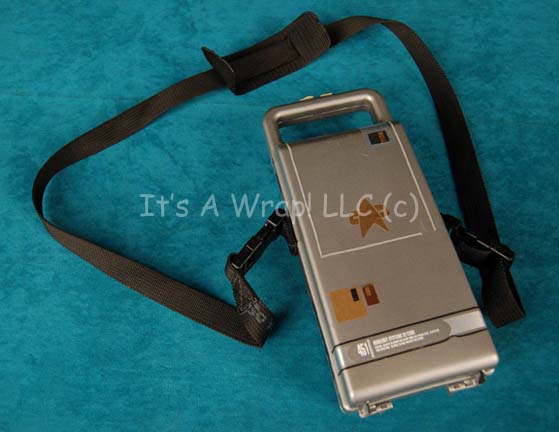 A carry case created for use in Star Trek feature films of episodic television. The item is an injection molded plastic case with a hinged base, the opposing end is sealed closed with metallic gold adhesive strips. A black nylon shoulder strap is affixed to the sides through Starfleet inventory … |