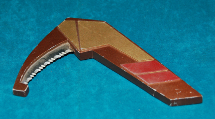 An item believed to be a prop Cardassian knife. The item is made from molded resin painted metallic bronze with gold colored accents. The item is vaguely ‘L’ shaped and features a practical (working) knife blade that is in fact quite sharp and serrated. The item depicts evidence of repair, … |