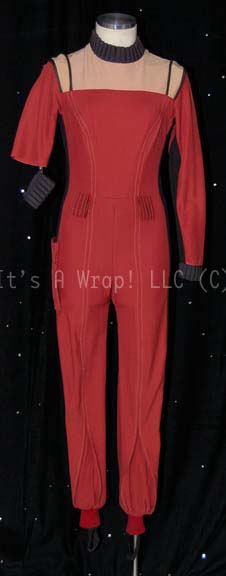 A costume similar to those featured between the second Star Trek feature film, “The Wrath of Kahn”, and the opening scenes of the seventh, “Generations”. This costume is a burgundy jumpsuit featuring tan shoulders, black piping, ribbing around the collar and cuff, belt loops around the waist, and a black … |