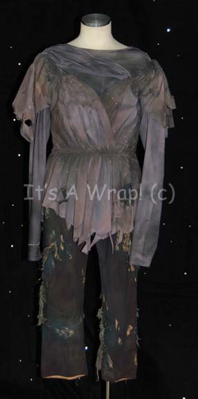 A costume like those created for the second Star Trek feature film. This costume is an alternate created for the “Kahn’s Woman” (Pam Bennett) character, it consists of short, gray dress and black trousers that have been greatly distressed to denote years of wear on the almost uninhabitable Ceti Alpha … |