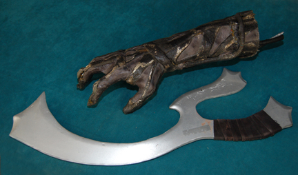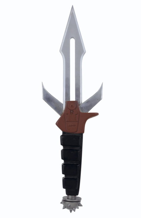 A three-bladed Klingon d'k tahg knife with aluminum blades and vacuum-formed plastic handle -- <I>16in. long</I> -- replica of the knife used to kill Kirk's son, David Marcus, in <I>Star Trek III: The Search for Spock</I> |