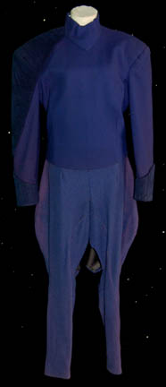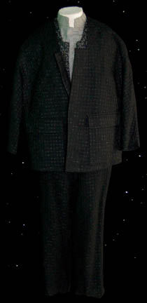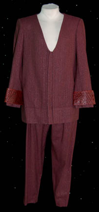 A costume featured in the Star Trek: The Next Generation episode “A Matter of Perspective” for wear by “Apgar” (Mark Margolis). The costume is plum colored trousers with silver thread flecks evenly dispersed throughout the fabric and a matching jacket top with a lot V-neck and a snap front, with … |