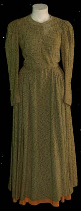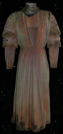 A costume featured in the Star Trek: The Next Generation episode “Who Watches the Watchers” for wear by “Nuria” (Kathryn Scott), leader of a proto-Vulcan village under observation by a Federation anthropolocigal survey team. The costume is a green colored dress with black specks intermittently visible which laces up the … |