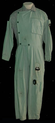 A costume jumpsuit featured in the Star Trek: The Next Generation episode “Home Soil” for wear by “Arthur Malencon” (Mario Roccuzzo), a hydraulic landform engineer who was killed by a ‘microbrain lifeform'. The costume is a gray and teal colored full length jumpsuit with multiple square metal buttons affixed to … |
