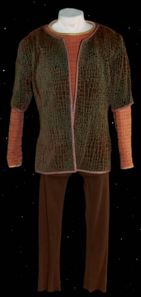 A costume featured in the Star Trek: Deep Space Nine episodes “Images in the Sand” and “Shadows and Symbols” for wear by Megan Cole as the Romulan Senator “Kimara Cretak”. This costume is a DS9-style Romulan Senator’s uniform; it consists of a long-sleeved, gray/olive-colored jacket featuring a pattern of convex … |