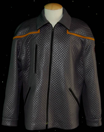 A stunt costume jacket style featured in early episodes of Star Trek: Enterprise like “Broken Bow”. The jacket is quilted diamond pattern fabric with a center zip that runs all the way up the collar and features command gold division striping around the shoulders with size adjusting cuffs, three zippered … |