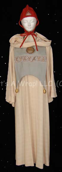 A costume item featured In the Star Trek: Enterprise episodes “Kir’Shara” and “Home”. This item is a long-sleeved, full-length, metallic-brown robe in the Enterprise-era Vulcan style featuring a black diamond pattern with an embroidered floral pattern in the middle, an iridescent, copper-colored lining, and an attached, matching hood. A sewn … |