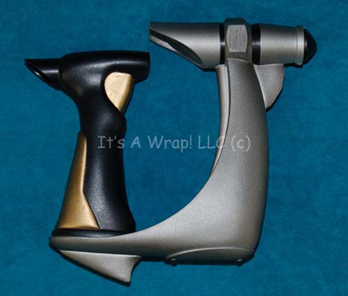 A prop item similar to those featured in various episodes of the last season of Star Trek: Deep Space Nine. This item is a molded-plastic, Cardassian holster made in the Breen style, painted dark-green with a spandex strap to tie around the leg and a textured, pyramidal, plastic belt. The … |