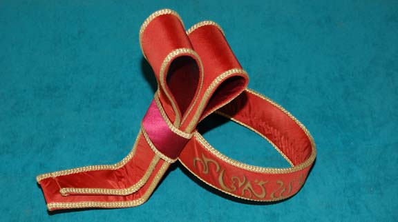 A costume accessory created for the Vulcan musicians present at the Fal-Tor-Pan ceremony in Star Trek III: The Search for Spock. The item is a wide band of rust red colored fabric trimmed with gold with gold painted Vulcan iconographic lettering around the exterior. The back of the item is … |