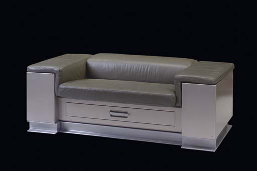 A couch of grey imitation leather, the wood frame painted to simulate metal, with brushed aluminium frame -- <I>70x35x26in.</I> -- used as set dressing in Captain Archer's quarters on the <I>Starship Enterprise</I> in <I>Star Trek: Enterprise</I> |
