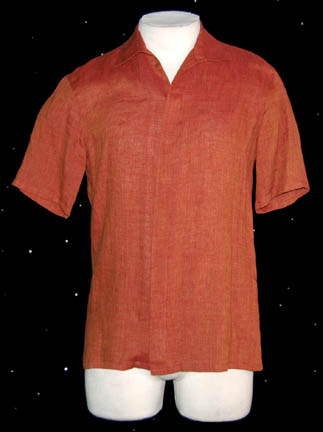 This brown shirt buttons down the front and was worn by “Malcolm Reed” (Dominic Keating) in the Star Trek: Enterprise episode “Two Days and Two Nights”. The inside tag reads “Enterprise, Dominic Keating #25”. |