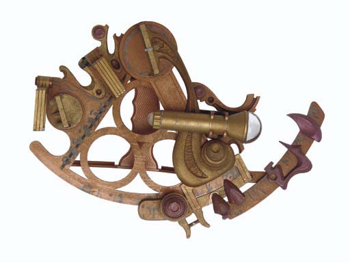 A prop sextant, the plastic sextant adapted with additional parts and markings to suggest an alien design, painted to simulate brass -- <I>12x 10x4½in.</I> -- used as set dressing in Captain Sisko's office in <I>Star Trek: Deep Space Nine</I> |