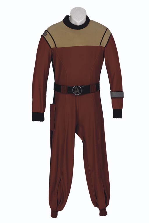 A men's Starfleet jumpsuit, <I>Star Trek II</I> style, with belt, sleeve band, and shoulder tabs, with <I>Paramount</I> label inside inscribed <I>M-42</I> -- made for a crew member for <I>Star Trek II: The Wrath Of Khan</I> (2) |