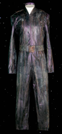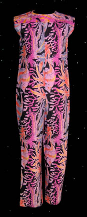 This great little costume was worn by one of the civilian children who lived onboard the U.S.S. Enterprise under Captain Picard during Star Trek: The Next Generation. The sleeveless jumpsuit has an amoeba pattern design in various shades of purple, pink, orange and yellow on a black background. It also … |