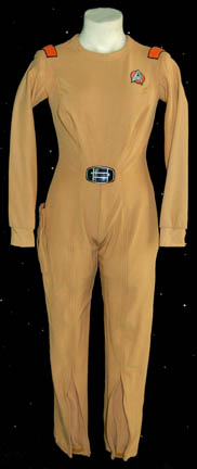 A tan colored Class-D Starfleet uniform jumpsuit with unattached matching shoes featured in Star Trek I: The Motion Picture. The costume features an affixed plastic bio-monitor, an affixed orange backed Starfleet logo patch on the left breast, and a pair of affixed orange division strips on the shoulders indicating the … |
