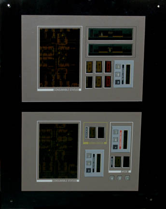 A piece of set dressing similar to those featured throughout Star Trek: Enterprise. This item is a control console for use on the “Enterprise NX-01”; it is a piece of smoked acrylic with two graphical applications adhered to the front and each with a large area at the bottom labeled … |