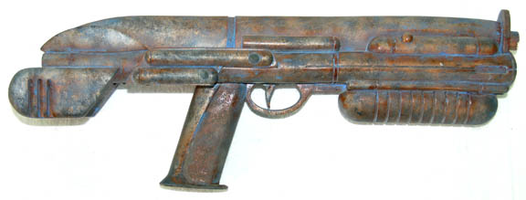 A cast rubber hand carbine painted to match the aged style of the “Alien Mine Guards” from the episode “The Xindi” of Star Trek: Enterprise. Vaguely shotgun in appearance they feature a handgrip with trigger and guard, another grip under the barrel affixed to a housing for a flashlight (as … |