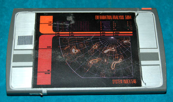 A prop item similar to those featured in various 24th century incarnations of Star Trek. This item is a PADD, Personal Access Display Device, a gray, plastic rectangle featuring a black appliqué of an EM Radiation Analysis, silver accents on the front and copper on the back; item can be … |