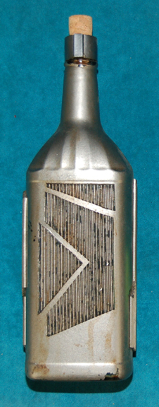 A prop Klingon blood wine bottle like those appearing in episodes of Star Trek: Deep Space Nine like “Way of the Warrior”. The item is a metallic gunmetal painted glass bottle with a cork stopper and multiple pieces of matching painted textured vinyl strips affixed externally. The bottle features stains … |
