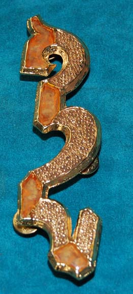 A molded metal badge created for wear by Vulcan characters in various episodes of Star Trek: Enterprise. The item is gold colored metal with orange marmalade colored ‘jewel’ insets, and pin backing for affixing to a costume. The item measures approx. 4 X 2.25 inches. Costume continuity guides indicate the … |