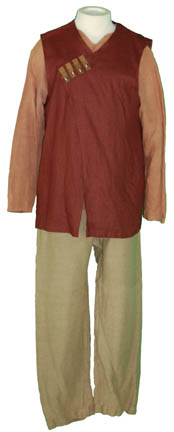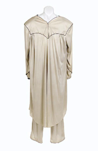 A full-length tunic of taupe nylon, with a matching pair of pants -- worn by Mark Lenard during Sarek's death scene in "Unification, Part I" <I>Star Trek: The Next Generation</I>; with corresponding wardrobe tag (2) |