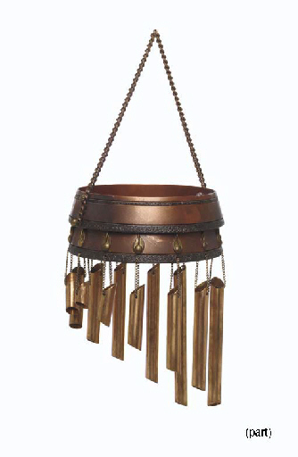 Two prop wind chimes, one round and one triangular both nonfunctional, made from plastic, brass, and copper tubing, adorned with Bajoran symbols and writing, largest -- <I>17in. high</I> -- used for set dressing on <I>Star Trek: Deep Space Nine</I>, the round chime featured in the Bajoran temple scene in "Resurrection" … |