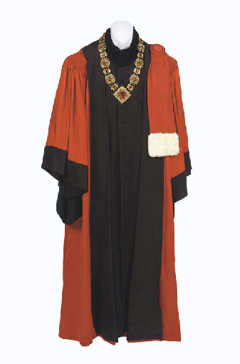 A red and black robe, with a gilt necklace with red stones and a pair of red imitation leather gloves -- worn by John de Lancie as Q in "All Good Things" in <I>Star Trek: The Next Generation</I> (4) |