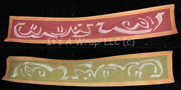 A piece of set dressing believed to have been featured in the Star Trek: Enterprise episode “Rajiin”. This item is a dark-magenta colored banner with speckled orange trim and white, alien iconographic symbols down the length of it on one side and light green in place of the magenta on … |