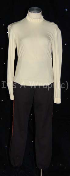 A lot of costume elements like those featured in Star Trek feature films from “The Wrath of Khan” to the opening scenes “Generations”. This lot consists of a long-sleeved, Starfleet uniform undershirt in Command white with a ribbed collar and zip down the back. Included are black uniform trousers featuring … |