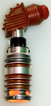 A prop weapon used in various episodes of Star Trek: Voyager. The item is resin cast with a metal stock, a working light in the scope powered by a series of 6 AA sized 1.5volt batteries housed in the metal stock accessed by unscrewing the end and activated by a … |
