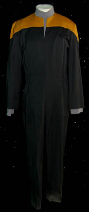 A costume featured in the episode "One Small Step" of Star Trek: Voyager for wear by "Ensign Harry Kim" (Garret Wang). The costume is an operations gold Starfleet officer's dress uniform with gold accented collar and wrap around, zipper/button/clasps up the side, corresponding trousers, and clasps on the stirrups. The … |