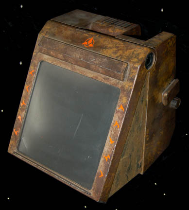 A plastic ‘computer' sized to be carried with by a small handle. The ‘screen’ deploys to set at an angle. The whole item has been painted a variety of browns to give it an aged appearance. An orange symbol of the Klingon Empire is present above the screen with a … |