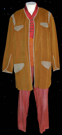 This great costume was made for a Vulcan in the Star Trek: Enterprise episode, "Carbon Creek". The jacket is made of brown and tan leather with a broken-line pattern on the tan sections. There are also tan pleats down the sleeves. It zips up the front and has a cast … |