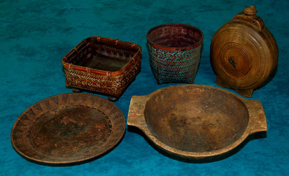 This five piece wooden lot was used during the filming of Star Trek episodic television and/or feature films. The lot includes two wooden wicker baskets; one round the other square, a wooden plate with a woven rim, a hand fashioned wooden bowl and a wooden canteen. The largest item measures … |