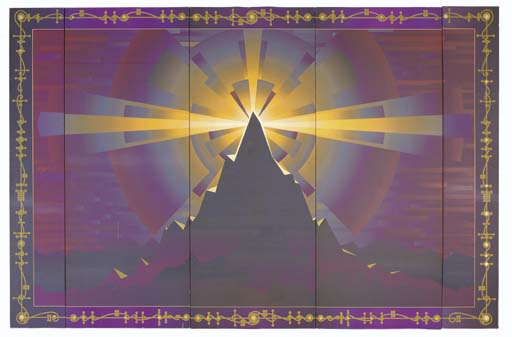Five inkjet prints on canvas mounted onto solid flat frames, the five prints forming a graphic art image of the sun rising over Mount Seleya, bordered by Vulcan script writing, each -- <I>118in. high</I> -- featured as set dressing in the Vulcan High Command set in "Awakening" and "Kir'Shara" in … |