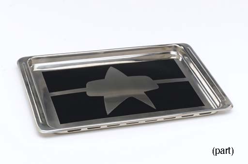 Seven metal serving platters with black vinyl covering, displaying the Starfleet arrowhead symbol, five are -- <I>11x17in.</I> -- two are -- <I>9½x15in.</I> -- used as set dressing in the <I>Starship Defiant</I> mess hall set in <I>Star Trek: Deep Space Nine</I> (7) |