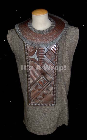 A costume featured in the ninth Star Trek feature film, “Insurrection”; wherein the crew of the “Enterprise-E” rebels against Starfleet and the Federation to prevent the exploitation of a defenseless race called the Baku. This costume consists of two sleeveless, metallic-colored, shirt of a spandex-like material, a long-sleeved, tan tunic … |