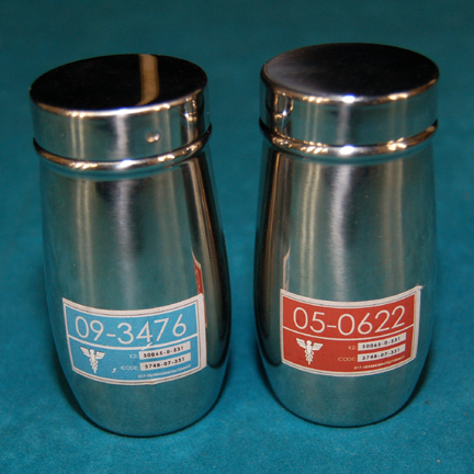 A pair of lidded metal containers like those appearing variously in episodes of Star Trek: Enterprise on the set of “Dr. Phlox’s” (John Billingsley) sickbay. The items feature plastic sifters, metal lids, and a red or blue Starfleet inventory application on the side. The item s measure approx. 3.73 X … |