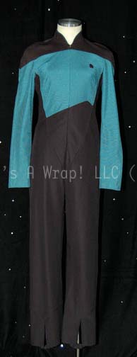 A costume featured in various episodes of Star Trek: The Next Generation and then reused in the seventh Star Trek feature film “Generations”. This costume is for wear by the stunt person for Gates McFadden (Dr. Crusher), Jane Austin, and is a long-sleeved, full-length Starfleet uniform jumpsuit consisting of black … |