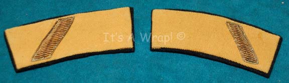 A pair of matching division-rank strips like those appearing in Star Trek I: The Motion Picture on Starfleet officer’s uniforms. The items are black felt backings with yellow colored fabric and gold thread embellishments indicating the wearer to be a ‘lieutenant’. Items like these appeared on the shoulders of class-B, … |