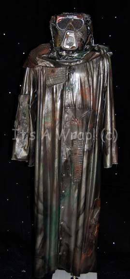 A costume featured in the Star Trek: Voyager episode “Prototype”. The costume is black trousers with a silver iridescent sheen and a black top with crumple textured long sleeves. The costume comes with a vacuum formed face mask that is complimented by a rubber neck covering of a matching color … |