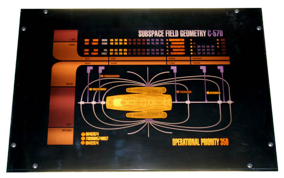 An LCARS (Library Computer Access and Retrieval System) style computer interface panel presumably featured in Star Trek IX: Insurrection. The item is a piece of smoked acrylic with a multi-colored graphical application adhered to the reverse meant to appear when backlit. The graphic depicts a shuttlecraft diagram and ‘Subspace Field … |