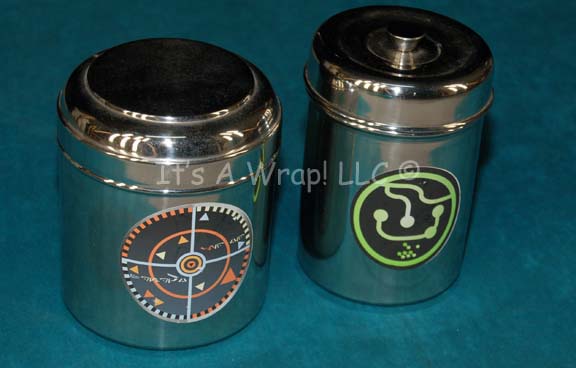 A pair of ‘Sitlax’ name brand stainless steel containers with lids appearing variously in episodes of Star Trek: Enterprise in the sickbay set of “Dr. Phlox” (John Billingsley). The items are containers of differing sizes, each with multi-colored graphical applications adhered to the exterior depicting alien iconography, the green hued … |