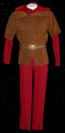 A costume made for actors portraying ‘Suliban' prisoners in a Tandaran detention camp in the Star Trek: Enterprise episode “Detained”. The costume is comprised of a hooded red jumpsuit and a diamond patterned tunic with belt loops for the corresponding leather belt. The jumpsuit features a ‘MUTO Little, Los Angeles’ … |
