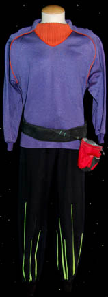 A rock climbing outfit featured in Star Trek V: The Final Frontier for wear by William Shatner in his portrayal of “Captain Kirk”. The costume is black trousers with florescent green accents up the lower legs and a waist tie, a purple iridescent sweater with orange accents at the collar … |
