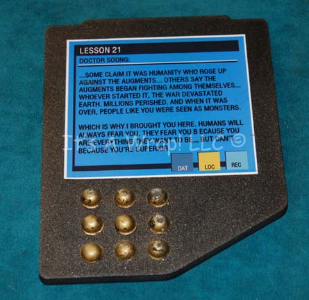 A sturdy PADD (Personal Access Display Device) featured in the episode “Cold Station 12” painted metallic pewter with applied gold painted rubber accent ‘buttons' and an application graphic depicting ‘Lesson 21, Dr. Soong’ and an essay on why ‘augments’ are superior to homo sapiens; the reverse features a graphic application … |