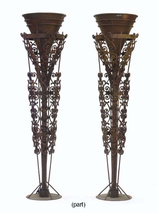 Eight floor-standing patinated torchère lamps with framing scrollwork and circular metal bases, each with four exposed, untested edison lamp bases (8) |