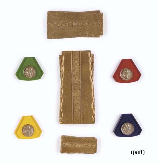 Eight plastic game chips, and three prop pieces of gold pressed latinum, made from acrylic plastic in assorted colors, with an inset metal coin featuring Quark's face -- used in Quark's Bar on <I>Star Trek: Deep Space Nine</I> (11) |